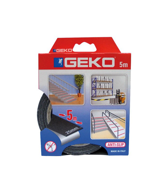 L'adhésifnoir - 25 mm x 5 m - antidérapant de la marque GEKO s'utilise en intérieur comme en extérieur. Il offre une haute résistance à l'eau.